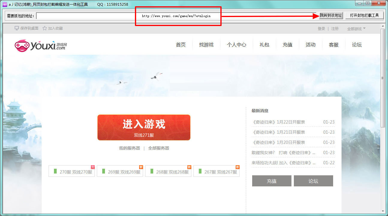 1、打开网页封包拦截编辑发送一体化工具,打开需要进行封包抓取的地址