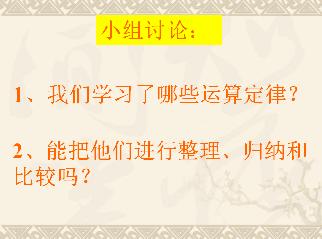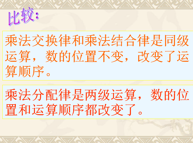 《乘法运算定律的应用》是在理解乘法的交换律、结合律和分配律基础上,引导学生根据算式及数的特征正确运用运算定律进行计算,提高用乘法定律进行简便计算的能力。以下是小编给大家带来的人教版小学四年级数学ppt课件,乘法运算定律的应用ppt课件,有需要的朋友可立即下载这个乘法运算定律ppt。