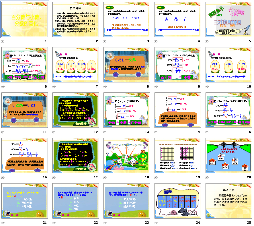 《百分数与小数、分数的互化》这节内容是理解并掌握百分数和小数互化的方法,能正确地把分数、小数化成百分数或把百分数化成分数、小数。下面带来的是人教版小学数学六年级上册百分数和分数小数的互化ppt课件,大家可以免费下载百分数和分数小数的互化ppt教学使用。
