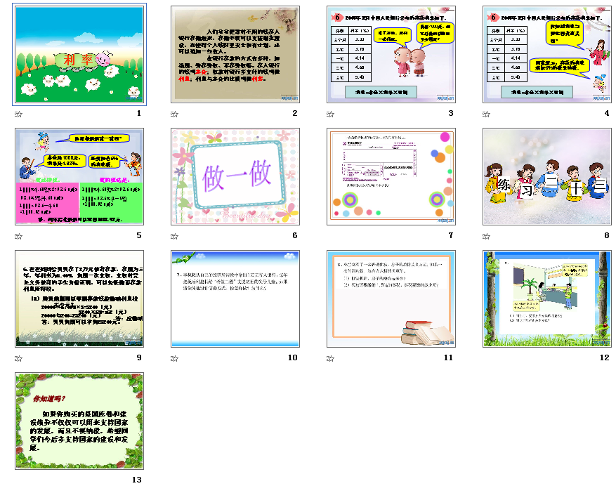 《利率》是生活中的应用的比例很常见的问题,利率问题关键是要学生理解储蓄方面的术语,如:本金、利率、利息、年利率、利息税和税后利息等。同时这类习题一般就是要求税前利息,税后利息,再加上到后一共可以取回多少钱这三种题型。下面带来的是利率ppt课件,需要的朋友可以免费下载利率ppt教学使用。