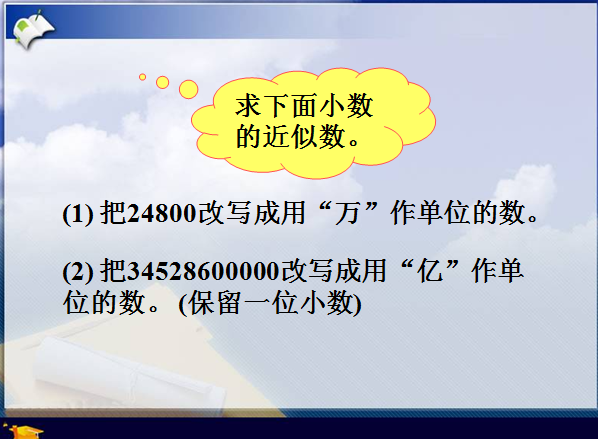 《求一个小数的近似数》本课重点是引导学生用“四舍五入”的方法,通过保留一定的小数位数,求一个小数的近似数,会把较大的整数改写成以“万”或“亿”作单位的小数。以下是小编给大家带来的人教版小学四年级数学ppt课件,求一个小数的近似数ppt课件,有需要的朋友可立即下载这个求一个小数的近似数ppt。