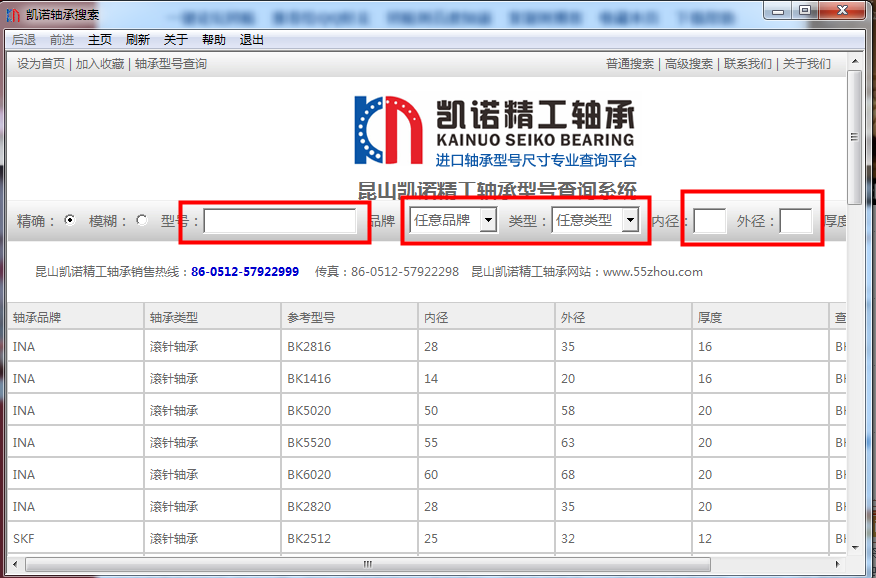 FAG、IKO、INA、KOYO、NACHI、NSK、NTN、SKF、TIMKEN九大品牌轴承的型号对应信息,便于轴承使用者、轴承销售人员、广大轴承设计和机械设计人员日常工作中使用。输入型号、内径、外径、厚度的任意数据值对轴承精确或模糊查询、新旧型号的对照转换、国产轴承型号与进口轴承型号的对照转换功能!