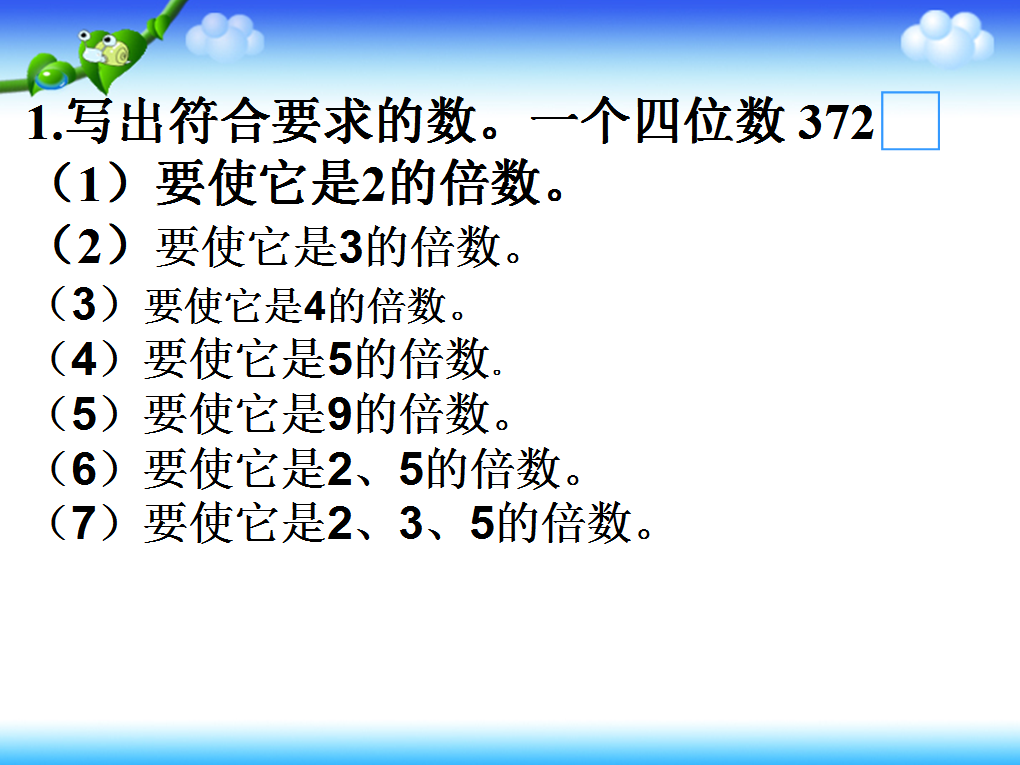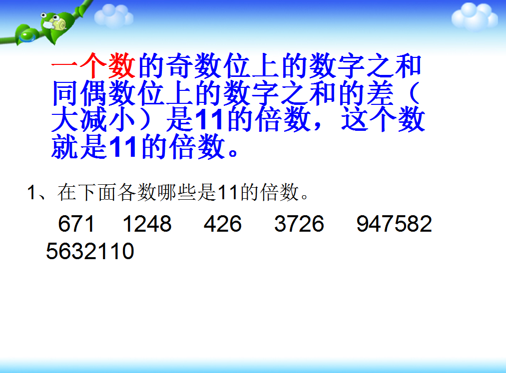 3的倍数有哪些特征呢?本节内容小编就为大家带来一份关于3的倍数特征ppt课件,该小学五年级数学下册ppt课件内容完整详细,共由16页组成,如果你需要一份这样的人教版小学数学课件下载资料,那就赶紧点击本文相应的下载地址将这份3的倍数特征ppt下载下来使用吧!