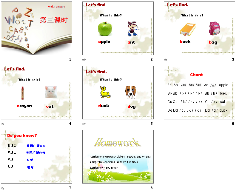 unit 2 colours Lesson 3这一小节内容是听懂、会说问候语Good morning.以及介绍别人用语This is ...四个字母的正确书写和c和d、b和d、c和b的发音,下面分享的是人教版小学英语三年级上册unit 2 colours Lesson 3第三课时ppt课件,需要的朋友可以点击下面的地址免费下载unit 2 colours Lesson 3 ppt教学使用。