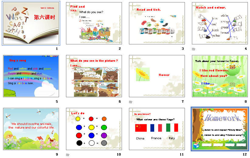 unit 2 colours Lesson 6第六课时这节内容是让学生会唱英文歌曲Colour song,做本课 Let’s check 部分的听力练习和做Start to read找字母、找颜色的练习。下面带来的是人教版小学英语三年级上册unit 2 colours Lesson 6第六课时ppt课件,需要的朋友可以免费下载unit 2 colours Lesson 6 ppt教学。