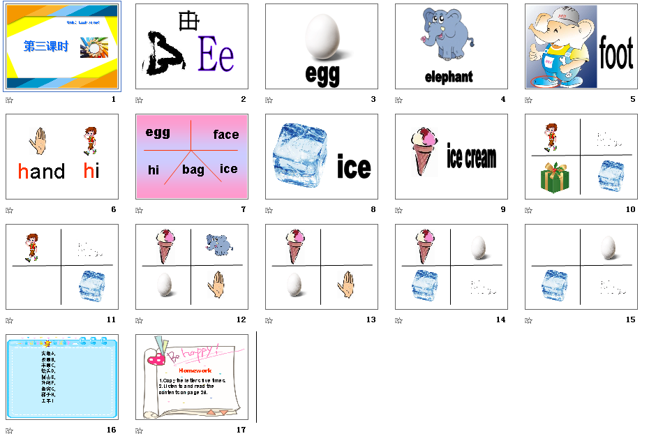 unit 3 Look at me Lesson 3第三课时让学生能听、说、读、写字母Ee, Ff ,Gg, Hh和Ii,并能听懂、会说以这些字母为首字母的单词。下面分享的是人教版小学英语三年级上册unit 3 Look at me Lesson 3第三课时ppt课件,需要的朋友可以免费下载unit 3 Look at me Lesson 3 ppt教学使用。