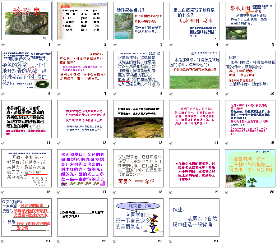 《珍珠泉》这是一篇略读课文,课文是按珍珠泉所在的位置,潭水的四周和泉水涌动的特点,以及“我”对家乡泉水喜爱的顺序写的。这篇文章描述了家乡珍珠泉的美丽、有趣,表达了作者热爱大自然、热爱家乡的思想感情。下面带来的是人教版小学语文三年级下册第一单元的第4课珍珠泉ppt课件,需要的朋友可以点击下面的下载地址免费下载珍珠泉ppt教学使用。