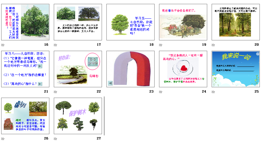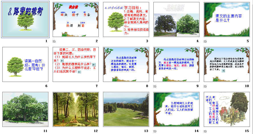 《路旁的橡树》这篇课文讲述的是人们在筑路的过程中设法保护一棵粗壮,结实、挺拔的橡树的故事,为了保护这棵橡树,筑路工人与工程师经过精心的设计,在不改变筑路计划的前提下,使公路在橡树边拐了一个马蹄形的弯儿,既保住了这棵橡树,又圆满地完成了筑路计划。下面带来的是人教版小学语文三年级下册路旁的橡树ppt课件,需要的朋友可以免费下载路旁的橡树ppt教学使用。