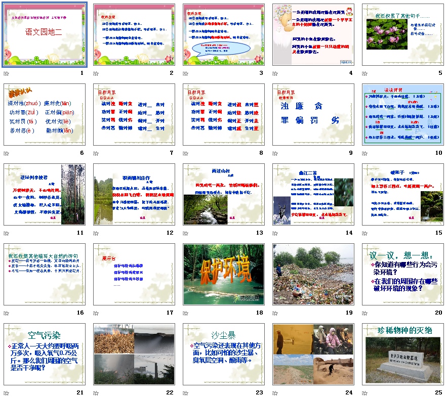 人教版小学语文三年级下册语文园地二是培养学生口语交际能力,增强保护环境的意识。教材在本组的导语、综合性学习提示中已经作了相关的说明。这次口语交际的目的,意在使学生将学习本组课文所获得的知识和能力、情感态度价值观等有效迁移,结合自己在综合性学习中的收获、体会,与同学就家乡的环境保护进行探讨和交流。下面带来的是人教版小学语文三年级下册三下语文园地二ppt课件,需要的朋友可以免费下载三年级下册语文园地二ppt教学使用。