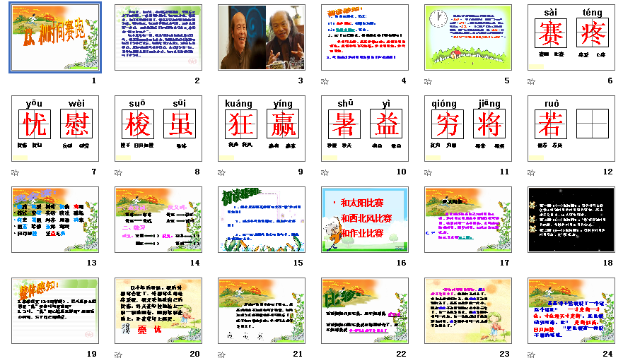 《和时间赛跑》这是一篇清新淡雅,又略带忧伤情绪的散文。写了“我”因为外祖母去世而悲伤不已,后来在爸爸一席话的启示下,从太阳落山,鸟儿飞行中,“我”明白了为什么要珍惜时间;从和时间赛跑的经历中,“我”体会到怎样珍惜时间的故事。下面分享的是人教版小学语文三年级下册和时间赛跑ppt课件,需要的朋友可以免费下载和时间赛跑ppt教学使用。