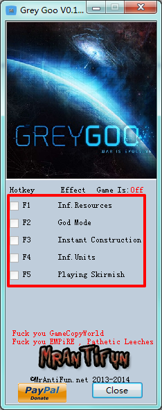 灰蛊修改器(GreyGoo)由MrAntiFun制作,包含无限资源、无敌模式、快速建设等5项功能,功能不算变态,但十分给力,适合玩家快速上手,或不能通关时使用。欢迎有需要的玩家下载!