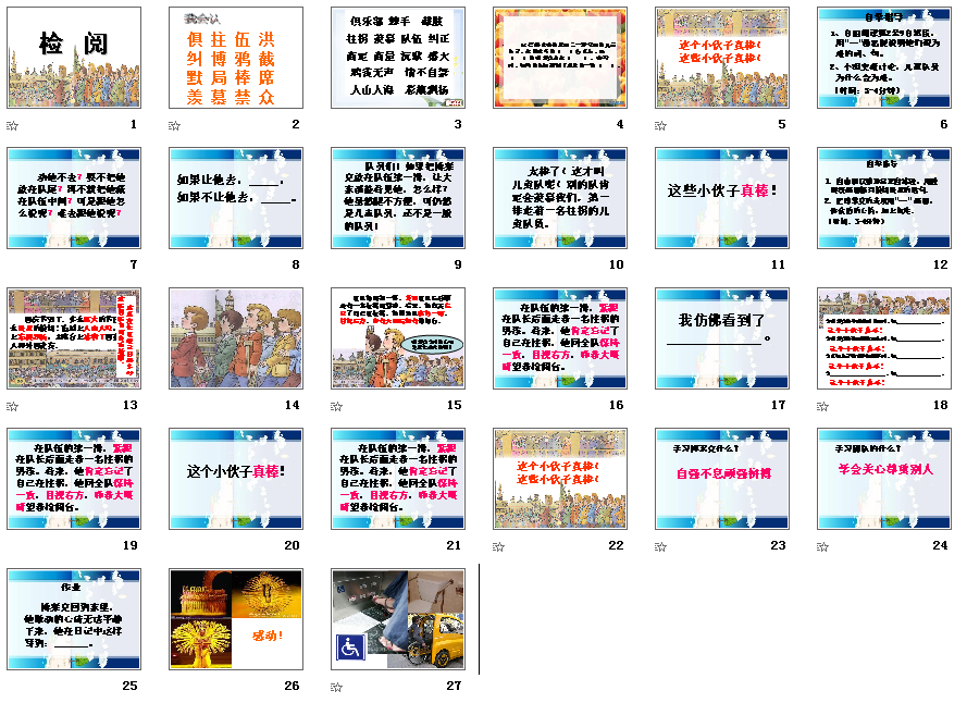 《检阅》这篇课文讲述波兰一所学校的儿童队员,在国庆来临之际,做出了一个大胆的决定:在国庆节的儿童队检阅时,让拄拐的博莱克走在第一排。游行时,他们的检阅队伍获得了大家的一致喝彩。下面分享的是人教版小学语文三年级下册检阅ppt课件,大家可以免费下载检阅ppt教学使用。