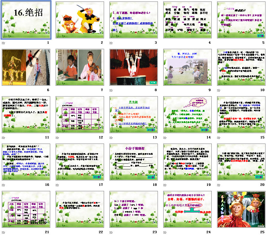 《绝招》这篇课文是人教版小学语文三年级下册的一篇课文,讲的是几个小伙伴之间发生的趣事,小柱子和小伙伴比本领,第一次输了,感到很羞愧,于是他暗自练习绝招。结果,在他的努力下,实现了自己的愿望。下面带来的是绝招ppt课件,需要的朋友可以点击下面的地址免费下载绝招ppt。