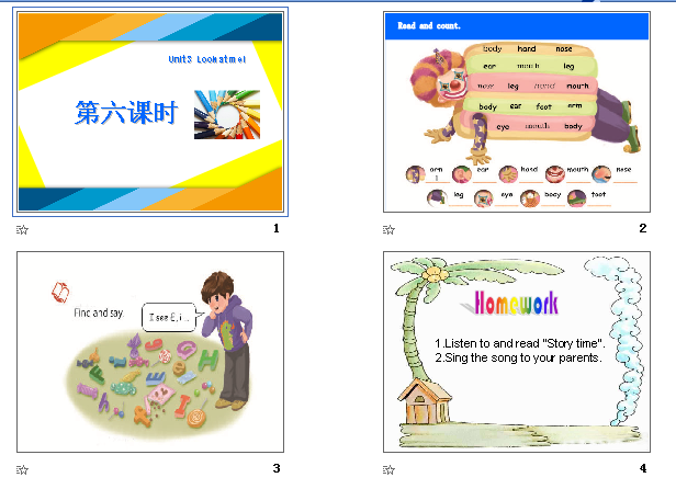 unit 3 Look at me Lesson 6第六课这节课是复习本单元所学的身体单词和所学过的字母,训练听力的同时检查学生对本单元内容的综合掌握情况。下面带来的是unit 3 Look at me Lesson 6第六课时ppt课件,大家可以免费下载unit 3 Look at me Lesson 6第六课时ppt教学使用。