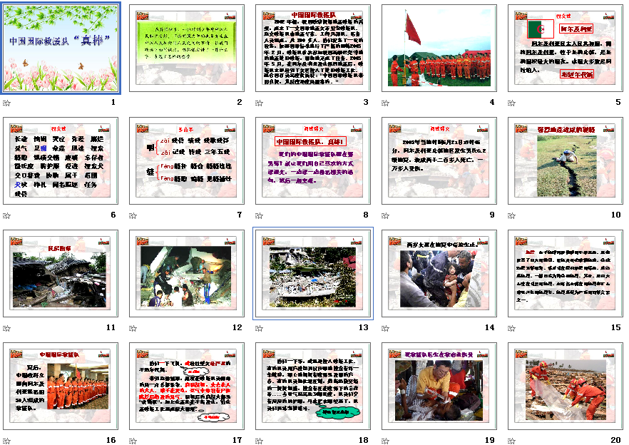 《中国国际救援队,真棒!》是由一篇通讯改写而成,写的是非洲国家阿尔及利亚发生地震,中国派出了救援队帮助救灾的事。通讯是一种常用的新闻体裁,是对新闻事件、人物和各种见闻进行及时、详尽而生动的报道。它不光交代什么事,而且交代事情的来龙去脉,以及情节、细节和有关环境气氛。下面带来的是人教版小学语文三年级下册中国国际救援队真棒ppt课件,大家可以免费下载中国国际救援队真棒ppt教学使用。