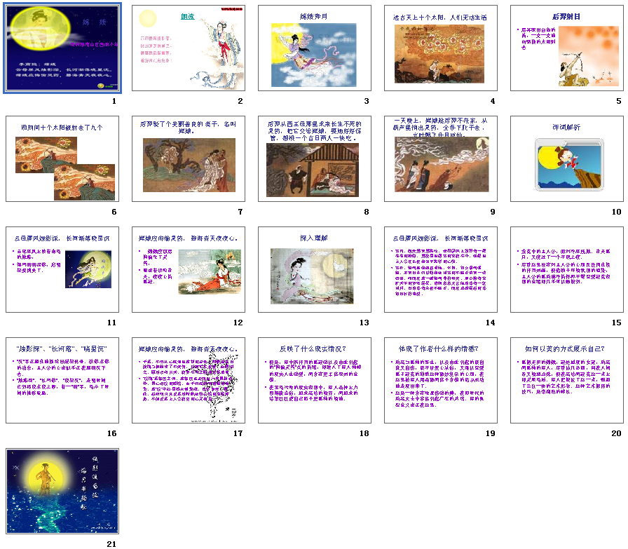 《嫦娥》是唐代诗人李商隐所作的一首古诗,是人教版三年级下册内容,全诗理解起来有一定困难。关于此诗的解释,过去的注家众说纷纭,有人认为是歌咏女子学道求仙,有人认为是歌咏意中人的私奔,有人认为是直接歌咏主人公处境孤寂,有人认为是借咏嫦娥另外有所寄托。一般认为是歌咏幽居寂处,终夜不眠的女子,借嫦娥飞月的故事抒写了身处孤寂中的感受。下面带来的是古诗两首嫦娥ppt课件,大家可以免费下载嫦娥ppt教学使用。