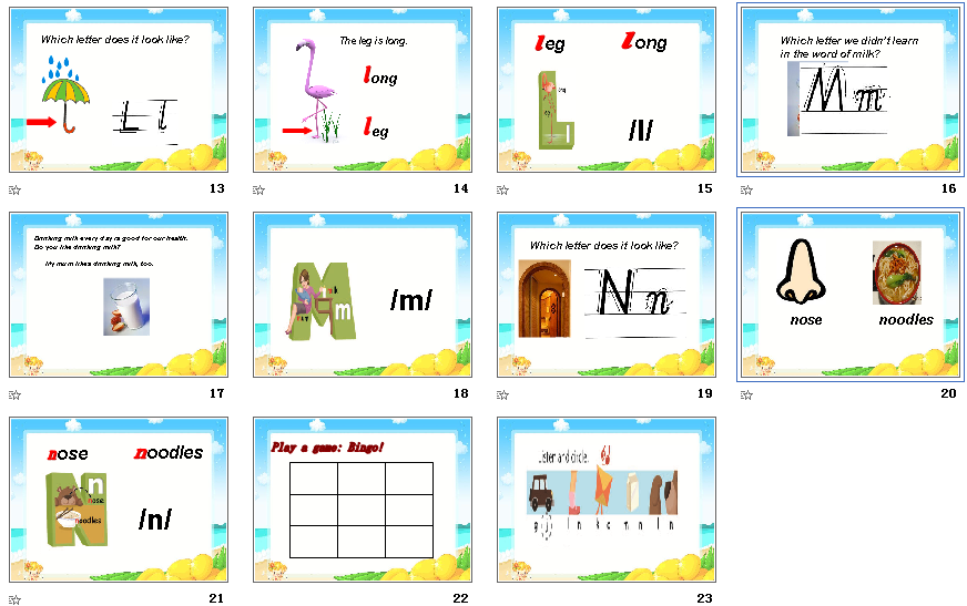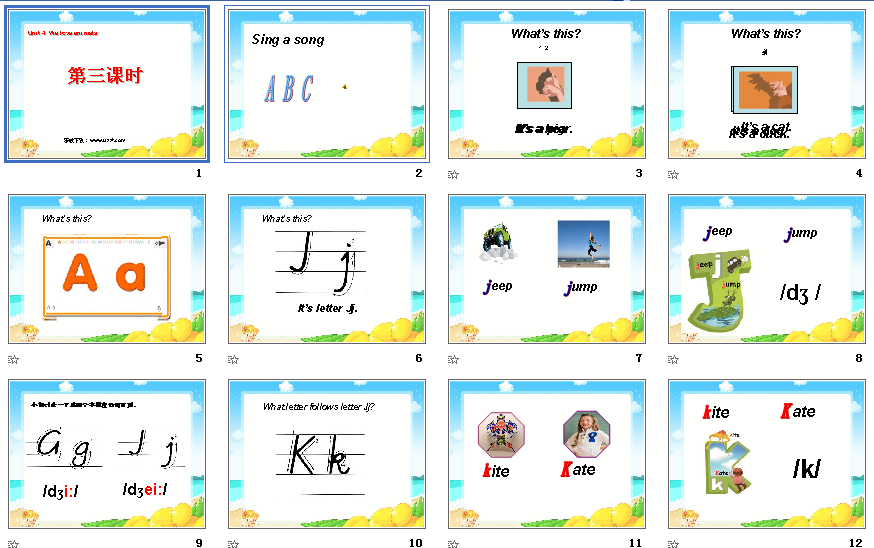 unit4 we love animals第三课时Letters and sounds部分只要学习Jj,Kk,Ll,Mm,Nn5个字母和这5个字母在单词中的发音,Start to read(Find and say)部分Find and say是一个字母认读活动,要求学生找出图片上出现的字母,并且能够准确地数出字母的个数。下面带来的是人教版小学英语三年级上册unit4 we love animals第三课时ppt课件,大家可以免费下载unit4 we love animals第三课时ppt教学使用。