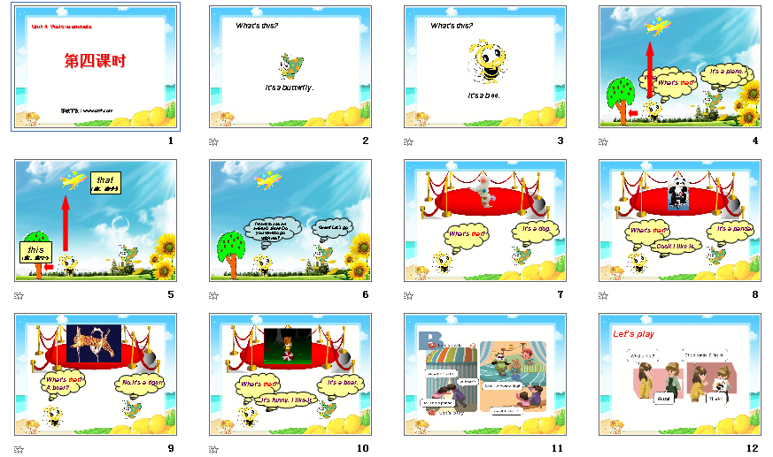 unit4 we love animals第四课时呈现的对话内容,是要求学生能理解对话大意,能用正确的语音语调朗读对话,并能在语境中区分和运用What’s this?和 What’s that?Let's play部分是为了巩固Let's talk 部分的内容,并培养学生学习兴趣而设计的。下面带来的是人教版小学英语三年级上册unit4 we love animals第四课时ppt课件,需要的朋友可以免费下载unit4 we love animals第四课时ppt教学使用。