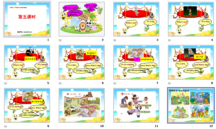 unit4 we love animals第五课继续学习6个动物的单词:zoo, elephant, bird, monkey, tiger, panda,Let's do部分要求学生模仿动物的形体动作,学生要能根据指令做动作。这里带来的是人教版小学英语三年级上册unit4 we love animals第五课时ppt课件,需要的朋友可以免费下载unit4 we love animals第五课时ppt教学使用。