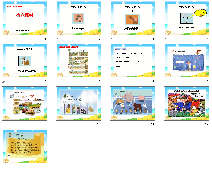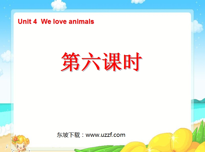 unit4 we love animals第六课时教学目标是能听懂、会说What’s this? It’s…. What’s that ? Look ,A funny dog!Cool! I like it.并能在实际情景中进行运用,听说、认读一些常见的动物的单词cat, dog, monkey, duck, panda, bird, pig, elephant,zoo,tiger,bear并能用英文介绍这些小动物,下面带来的是人教版小学英语三年级上册unit4 we love animals第六课时ppt课件,大家可以免费下载unit4 we love animals第六课时ppt教学使用。