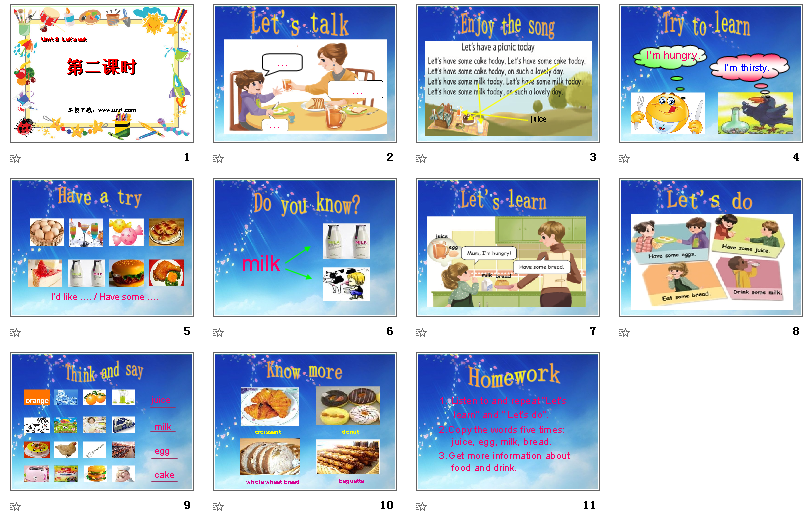 unit5 let's eat第二课时部分主要学习认读juice,egg,milk,bread 这些单词。要求学生能听懂、辨认图片中所学的食物及书写形式。并利用课文提供的场景和动作呈现句型,以加深学生对I’m hungry。Have some…语用功能的理解。这里带来的是unit5 let's eat第一课时ppt课件,需要的朋友可以点击下面的地址免费下载unit5 let's eat第一课时ppt教学使用。