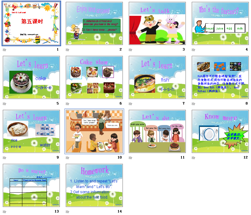 unit5 let's eat第五课时主要学习认读water, cake, fish,rice 这些单词。要求学生能听懂、辨认图片中所学的食物及书写形式。下面带来的是人教版小学英语三年级上册unit5 let's eat第五课时ppt课件以及教学反思,大家可以免费下载unit5 let's eat第五课时ppt教学使用。