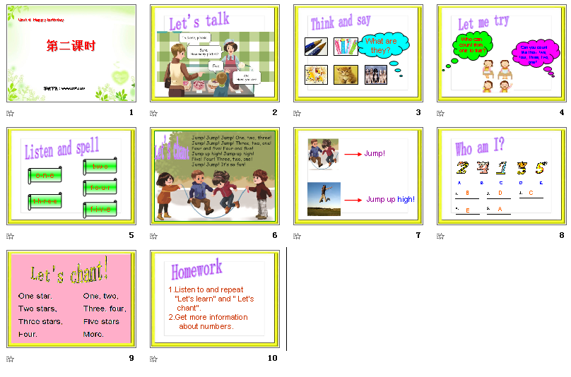 unit6 happy birthday第二课时主要要求学生能理解对话大意,能用正确的语音语调朗读对话,并能够在图片和教师的帮助下,在语境上中语用How many…?等询问物品的数量,count and say本部分通过一个生日派对的情境图进行数数活动来操练How many…?Five \Two的句型,下面带来的是unit6 happy birthday第二课时ppt课件,需要的朋友可以免费下载unit6 happy birthday第二课时ppt教学使用。