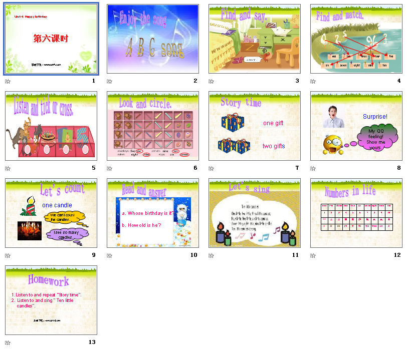 unit6 happy birthday第六课时主角是考察学生对本课所学内容的掌握程度,能听说、认读1-10 的数字,能明白“How old are you?" 和“How are you?”的区别,下面带来的是人教版小学英语三年级上册unit6 happy birthday第六课时ppt课件以及教学反思,大家可以免费下载unit6 happy birthday第六课时ppt教学使用。