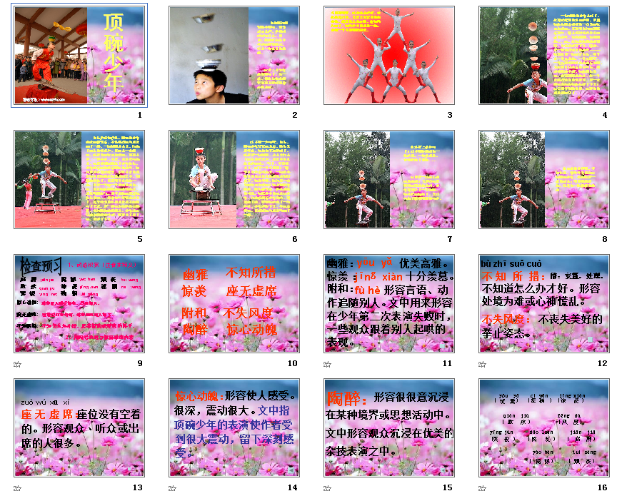 《顶碗少年》这篇课文是人教版六年级下册语文一篇略读课文,一位表演顶碗的少年在接连两次失误的情况下,最终获得了成功,赞扬了少年不怕失败、勇于拼搏的精神,文章描写了顶碗少年三次表演的过程,紧紧围绕表演的“惊心动魄”展开。下面带来的是顶碗少年ppt课件,大家可以免费下载顶碗少年课件教学使用。
