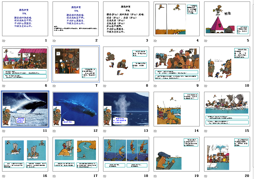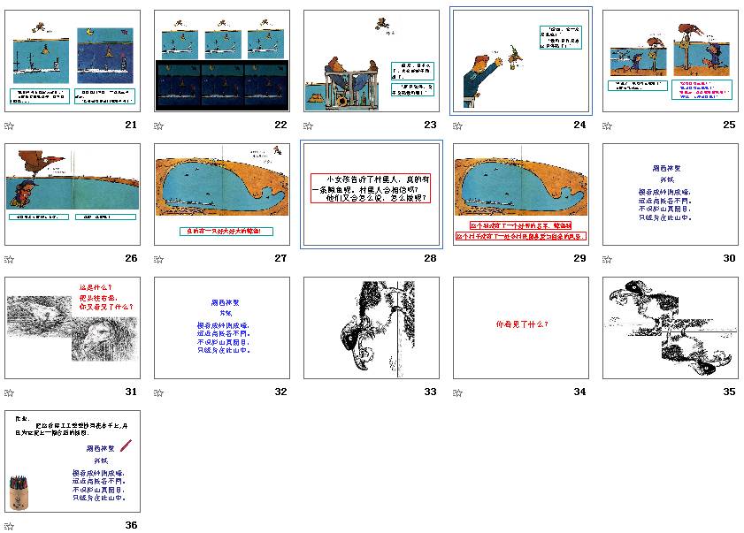 《鲸鱼》几乎每一页都能看到一只小鸟在空中飞翔,而这只小鸟几乎是一个表情——惊讶,不时的惊叫“鲸鱼”,于是故事围绕着人们去寻找鲸鱼展开,村子里的人们找来找去,都没有在湖里找到,他们开始抱怨候鸟欺骗了他们,最后应一个小朋友要求带他去看鲸鱼,原来,村边的湖的形状跟鲸鱼一样,而一户人家坏了的水管喷上来的水正象是鲸鱼喷出来的水,原来候鸟也并没有骗人。这里分享的是鲸鱼ppt绘本故事,适合给小朋友讲故事,喜欢的朋友赶紧下载吧。