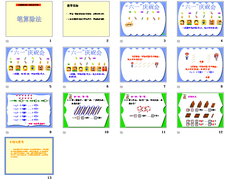 《笔算除法》这节课的重难点是让学生掌握试商的方法和准确书写商的位置以及明确算理,这里分享的是人教版三年级下册数学第二单元笔算除法ppt课件,需要的朋友赶紧下载笔算除法课件吧!