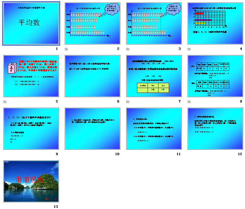 平均数是人教版三年级下册数学第三单元统计中的一节,教学目标是使学生理解平均数的意义,初步学会简单的平均数的方法,理解平均数在统计学上的意义,这里分享的是平均数ppt课件,需要的朋友可以点击下面的地址免费下载平均数ppt教学使用。