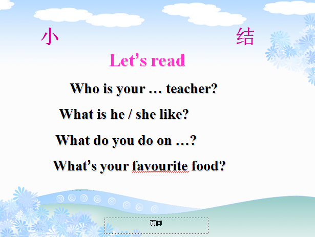 五上《Recycle 1第一课时》主要是复习1-3单元中的单词句子,另外通过学生采访自己的老师,了解老师的兴趣爱好,增进师生间的关系,采访自己的父母亲,增进父母与子女间的关系。以下是小编给大家带来的人教版五年级上册英语ppt课件,五上recycle 1第一课时ppt课件,有需要的朋友可立即下载这个五上recycle 1课件。
