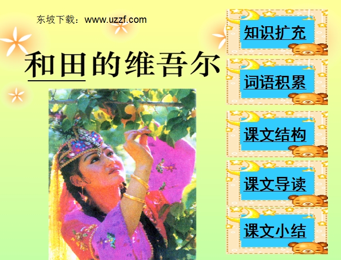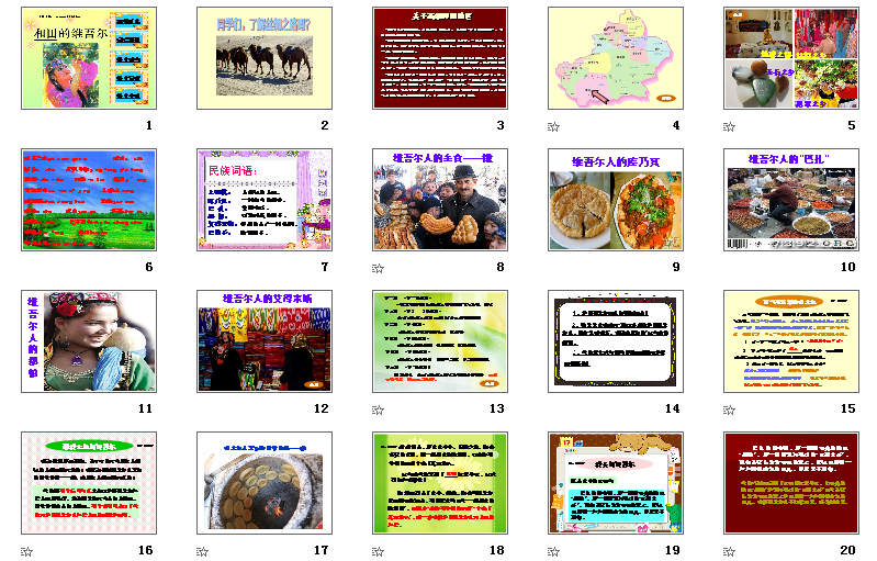 《和田的维吾尔人》课文首先讲“我”在和田的一次经历,亲身感受到维吾尔人特有的豪气与乐观。“沙尘暴铺天盖地地撕扯着黑暗中的一切”,飞奔的马车上“一个汉子嘶着沙哑的嗓子在迎风引吭”。和田是新疆维吾尔人最为集中的一个地区。提起和田,我们可能知道那是古丝绸之路的重镇和产玉石的地方;提起维吾尔族,我们眼前会浮现载歌载舞的情景。下面分享的是和田的维吾尔人ppt课件,大家可以免费下载六年级下册和田的维吾尔人课件教学。