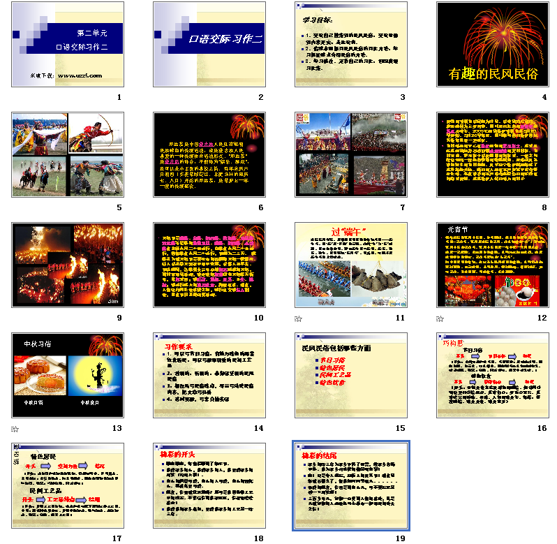 六年级下册口语交际习作二交流自己搜集到的民风民俗,交流时做到内容充实,表达流利。选择的内容可以是节日习俗,也可以是富有地方特色的服饰、饮食、民居或新颖、别致的民间工艺品;可以是课外阅读时知道的,也可以是调查访问了解到的或是在别的地方亲眼看到、亲身感受到的。只要是关于民风民俗的内容,都可以成为本次口语交际和习作的内容。下面分享是六下口语交际习作二ppt课件,需要的朋友可以免费下载六年级下册口语交际习作二课件。