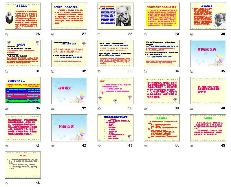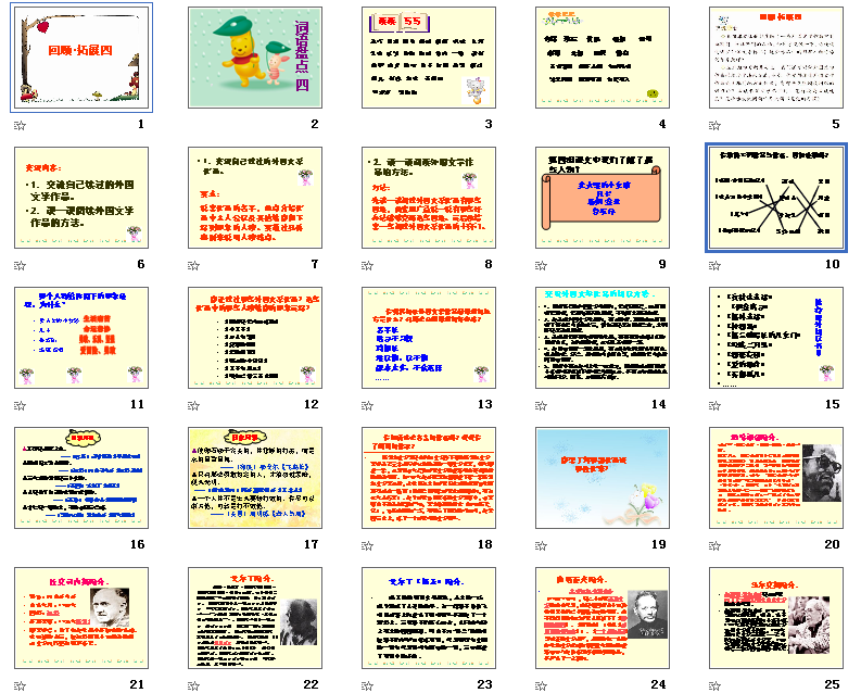 人教版小学语文六年级下册回顾·拓展“交流平台”的目的,一是引导学生阅读外国文学作品,二是通过交流学习一些阅读外国文学作品的方法。“日积月累”安排的内容是积累诺贝尔文学奖获奖作家作品中的隽语。目的是使学生积累文学作品中富有人生哲理的语句,培养善于积累的读书方法。“趣味语文”安排的是一组外国著名作家的轶闻趣事。目的是了解几个外国作家的故事,体会他们语言的幽默和巧妙。下面带来的是六下回顾拓展四ppt课件,需要的朋友可以免费下载六年级下册回顾拓展四课件。