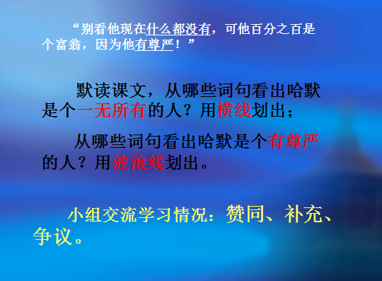 《尊严》讲的是美国石油大王哈默年轻时,拒绝别人的食物,因为他觉得不能白吃别人的东西,后来在杰克逊家里做事,他领悟到只有尊重自己,才能得到别人的尊重,引导学生要学会自立自强。以下是小编给大家带来的人教版四年级下册语文ppt课件,尊严ppt,有需要的朋友可立即下载这个人教版尊严ppt。