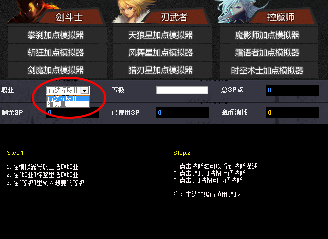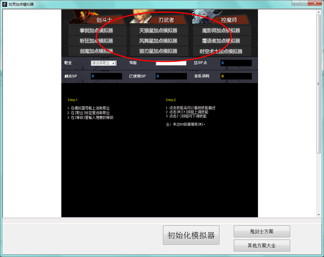 1、打开剑灵加点模拟器,在模拟器导航上选取职业