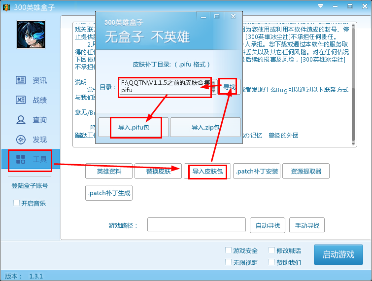 2.“300英雄盒子”——工具——导入皮肤包——寻找 300英雄盒子皮肤包(下载后解压)“.pifu文件”——导入.pifu包(如下图)