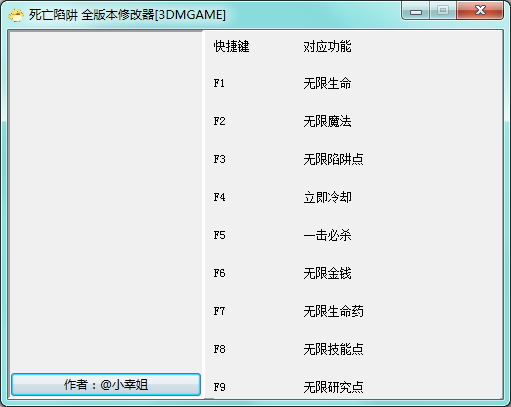 死亡陷阱全版本修改器由3DM制作,包含无限生命、立即冷却、一击必杀等九项功能。助力玩家轻松游戏,轻松通关游戏各个难度,畅享游戏乐趣。欢迎下载使用!