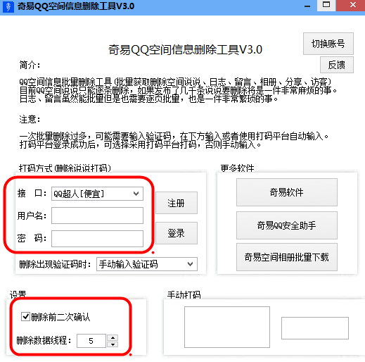 一次批量删除过多,可能需要输入验证码,在下方输入或者使用打码平台输入,打码平台登录成功后,可选择采用打码平台打码,否则手动输入