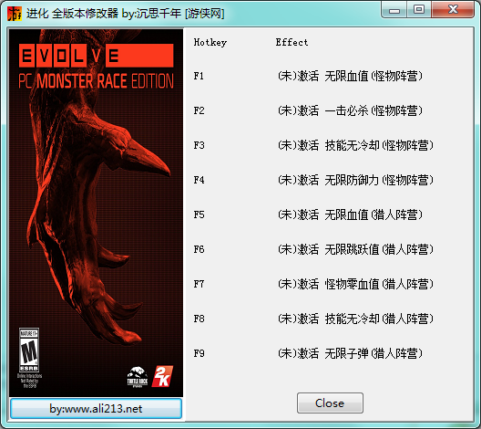 进化全版本修改器由游侠网网友制作,是同名游戏《进化(Evolve)》的修改器工具。该修改器包含无限血值、一击必杀、怪物零血值等九项功能,分别应用于怪物阵营和猎人阵营。欢迎有需要的玩家下载使用!