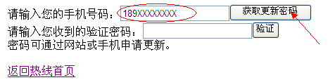 第二步:在方框内输入您的手机号码,点击“获取更新密码”,此时系统会给你发送一条带有验证密码的短信,请在下框输入短信中的验证码,验证您是否为电信手机用户(该验证不收取用户任何费用)
