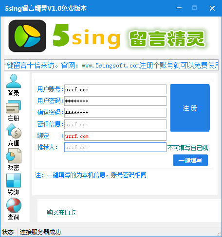 5sing留言精灵是一款绿色小巧、免费好用的5sing一键留言工具。该软件可一键批量5sing留言,迅速提高音乐人气,走红于网络。欢迎下载使用!