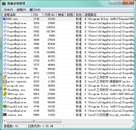 1、打开易窗进程管理器,软件自动读取当前电脑进程