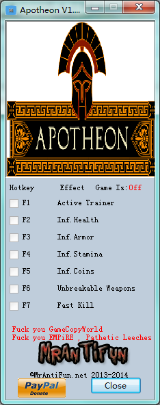 亚普罗辛六项修改器由MrAntiFun制作,包含了无限生命、无限耐力、快速击杀等六项功能,非常给力,助力玩家轻松游戏于亚普罗辛的大陆上。欢迎下载使用!