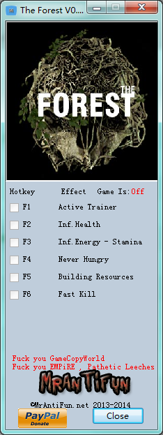 近期,由于很多玩家都抱怨森林怎么怎么难玩,今天小编就给大家带来了一款修改器。森林六项修改器是由MrAntiFun制作的一款含六项功能的《森林(The Forest)》游戏修改器。该修改器包含无限生命、无限能量、不会饥饿等给力功能,助力玩家轻松畅游于森林的世界里。