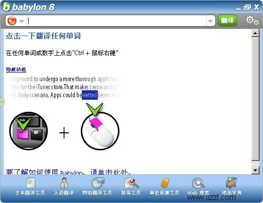 Babylon 从刚出现到现在,用户口碑都是非常好的一款翻译软件,它来自以色列,应该是当地最强大的英文翻译软件了。在全球已有超过 70 个国家 2 千 2 百万人使用。Babylon-Pro 提供最专业英文翻译。Babylon 可以轻松外加其它语言字典,提供让您翻译一次可同时得到其它语言的翻译。例如您的字典清单中有英英、英中、英德、英日、英韩的字典时。当您查询一个英文单字时,她便同时一次给您所有英中德日韩文的翻译。