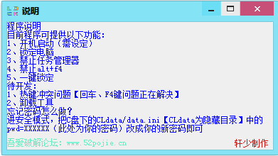 轩少电脑锁是一款绿色小巧的由网友轩少制作的电脑锁屏软件。该软件界面美观、简单易用,支持开机自启,一键锁屏,同时可以禁止任务管理器,锁屏后,只要没有密码,就打不开你的电脑。欢迎下载使用!