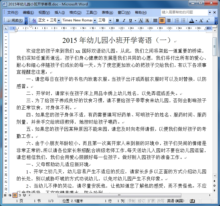 一、请您每日在孩子的书包内放套衣服。当孩子出汗或弄脏衣服时可以及时替换,以防感冒。